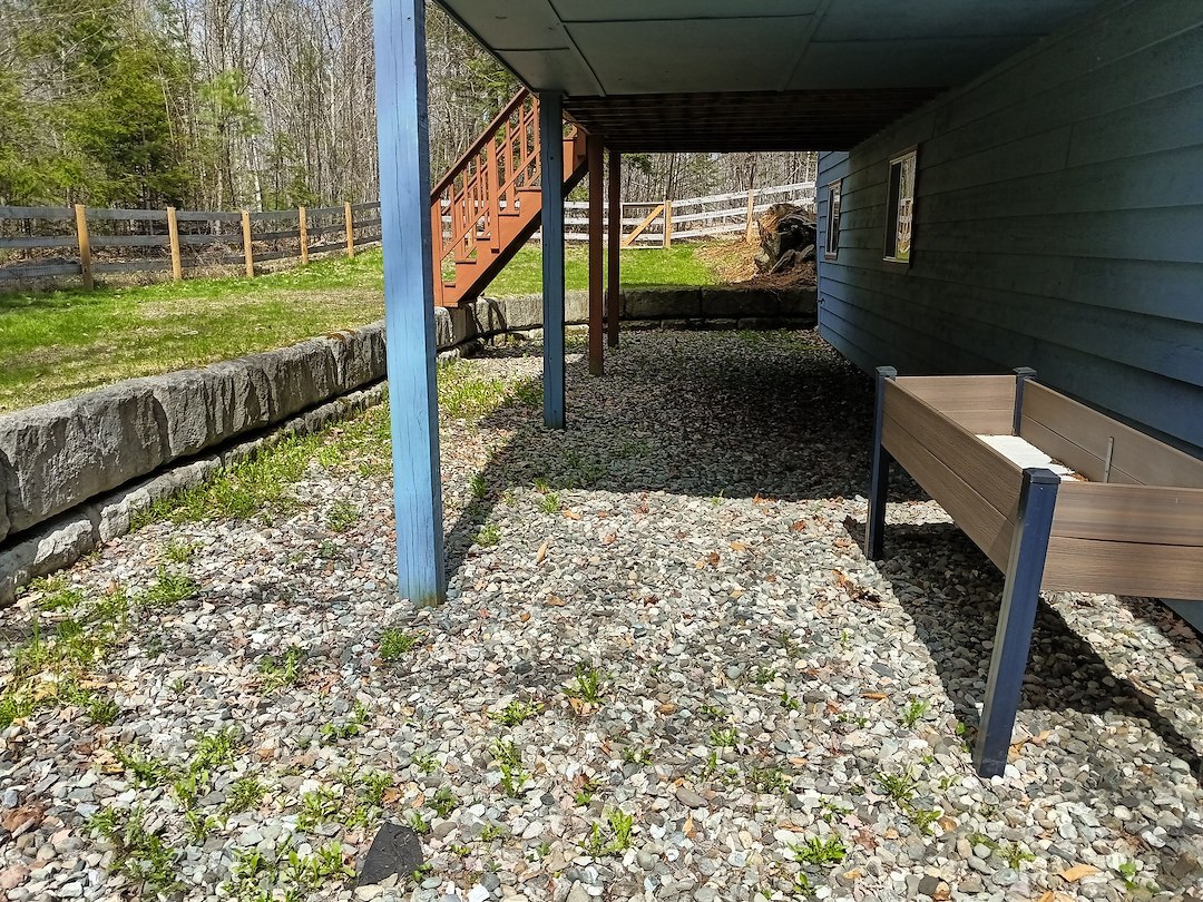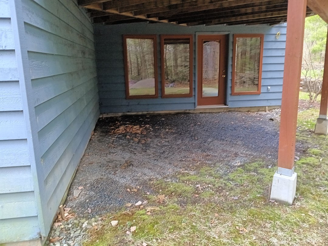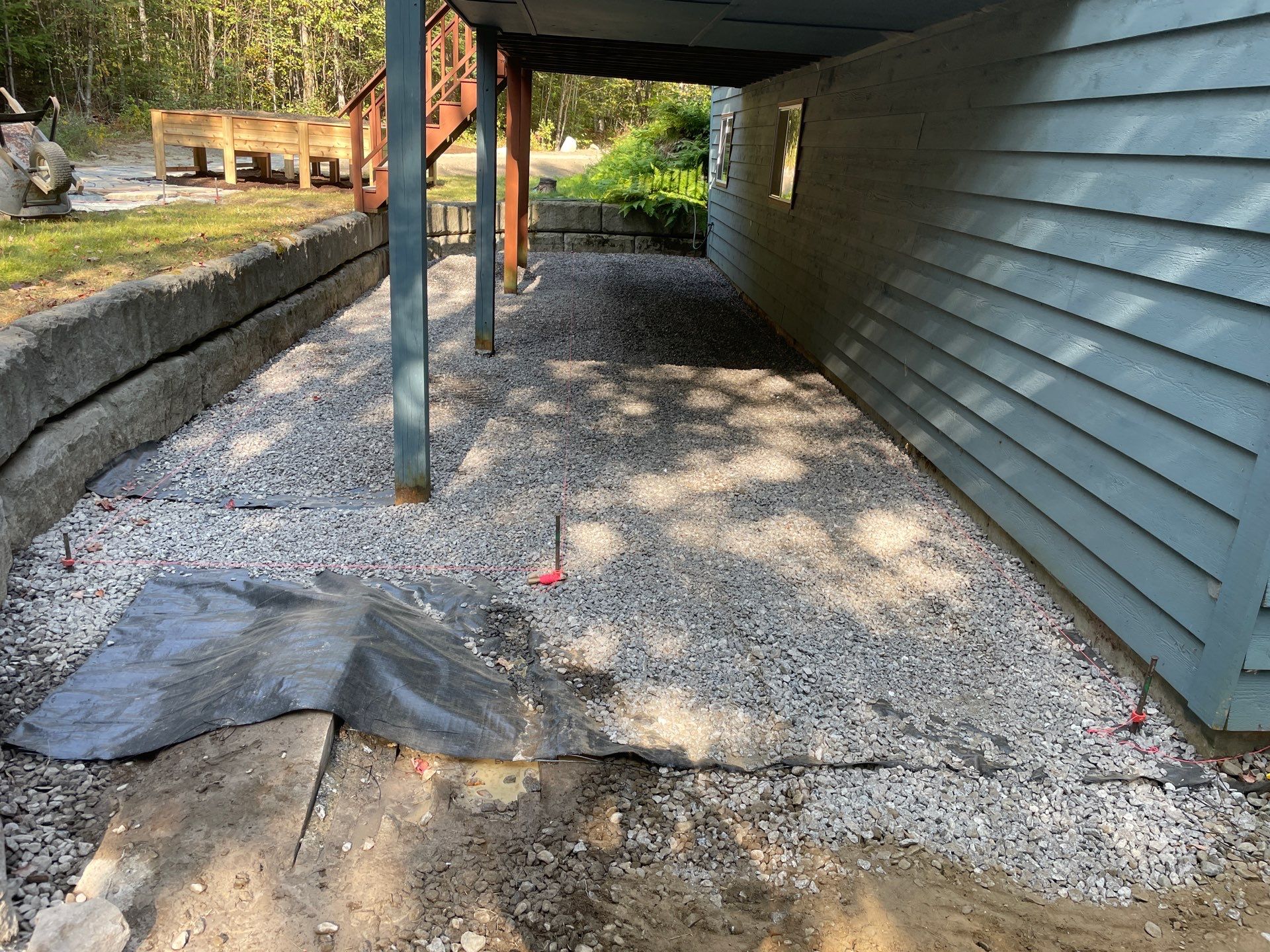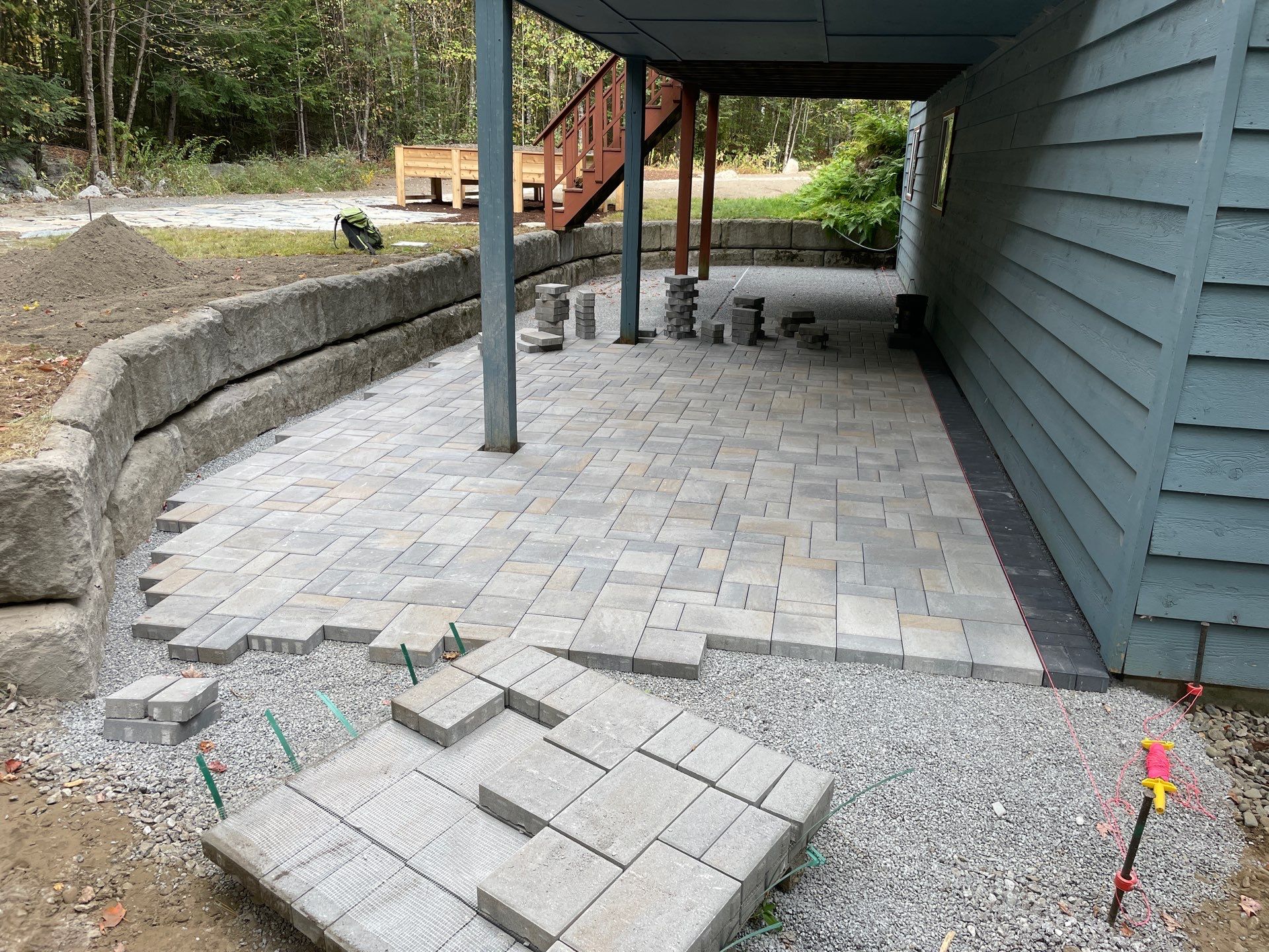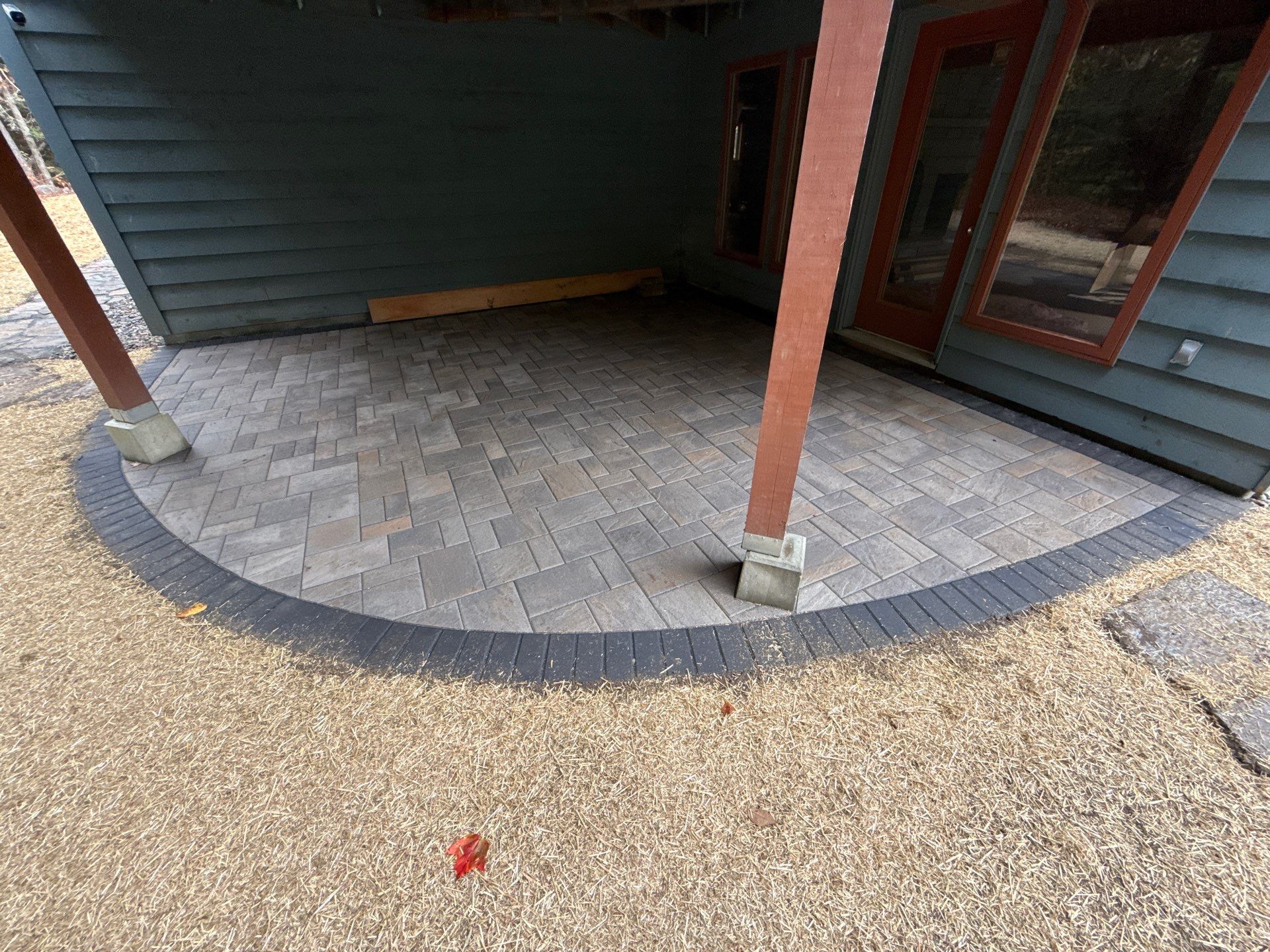 This covered patio features Techo-Bloc Blu 60 pavers with an Onyx Grey border for clean definition. The random pattern keeps the look simple and modern, built with durable concrete made to last. A matching front door paver entryway creates a seamless transition, welcoming guests with the same clean, modern style right from the entrance.