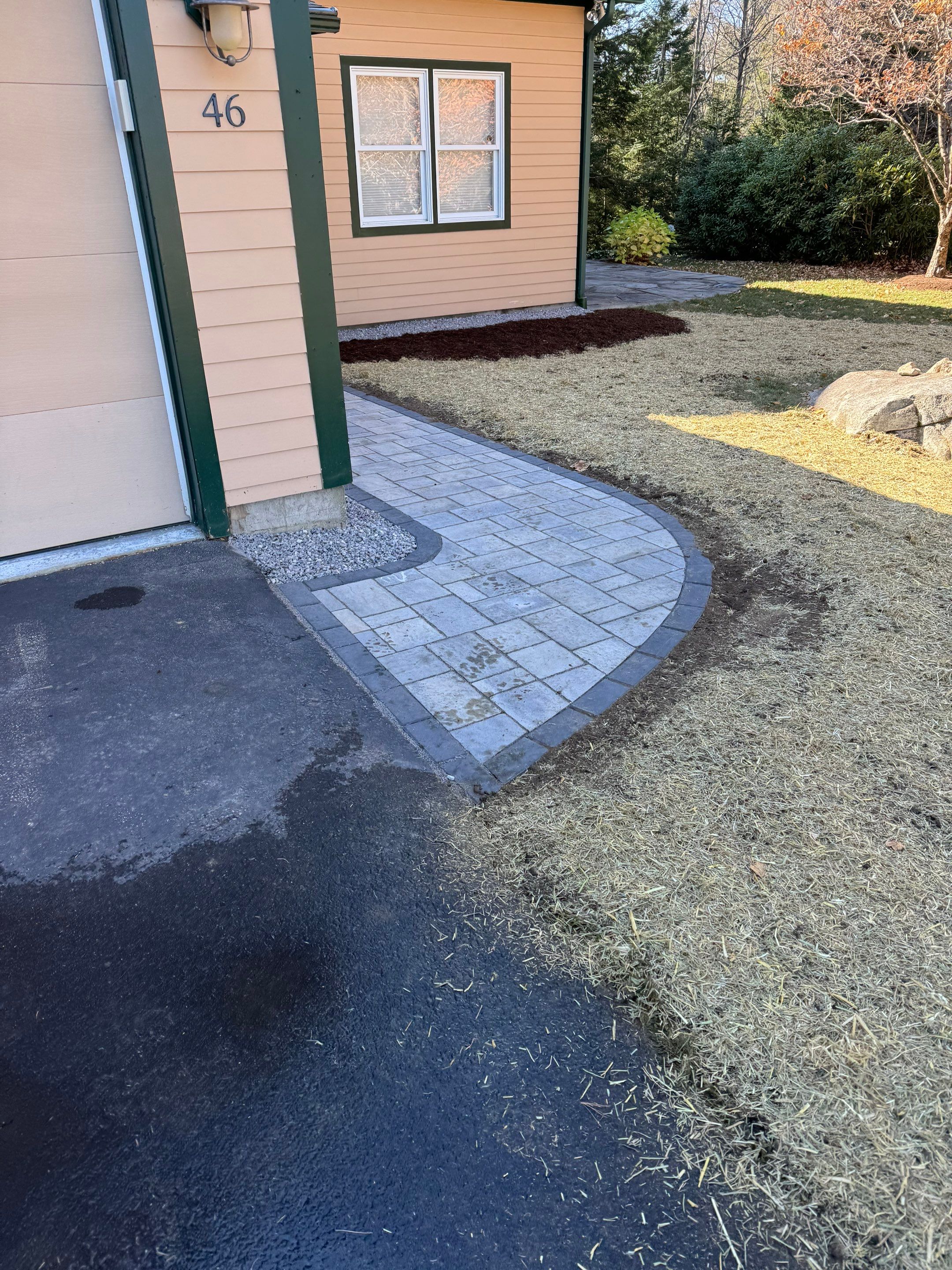 JCB Designscapes LLC, your stone hardscaping professional, successfully completed a Timless Entryway Walkway crafted with Techo-Bloc shale grey concrete pavers, showcasing a refined mix of rectangular stones framed by an onyx border.